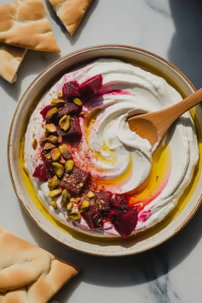 What makes this dish so exceptionally delicious is its harmonious blend of flavor and texture. The beets are slow-roasted to concentrate their natural sugars and create a tender, melt-in-your-mouth consistency. This sweetness is perfectly offset by the feta, which is whipped with a touch of olive oil and lemon into a light, airy, and creamy dip. Toasted pistachios are scattered over the top, adding a crucial layer of nutty flavor and delightful crunch. Food experts explain that this combination is a masterclass in balance: the salty, tangy feta cuts through the sweetness of the beets, the creamy dip provides a luxurious counterpoint to the tender vegetable, and the crisp pistachios add a final, satisfying textural element.