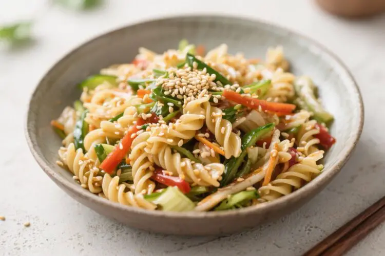 This salad combines tender pasta with crunchy veggies and a bold sesame dressing. The contrast in textures keeps every bite interesting.