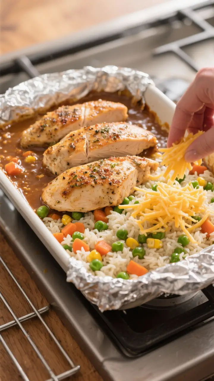 - Uncover and finish. Remove the foil, sprinkle cheese over the chicken if using, and bake another 20–25 minutes, or until the chicken reaches 165°F (74°C) and the rice is tender. If using potatoes, you may need an extra 5–10 minutes.