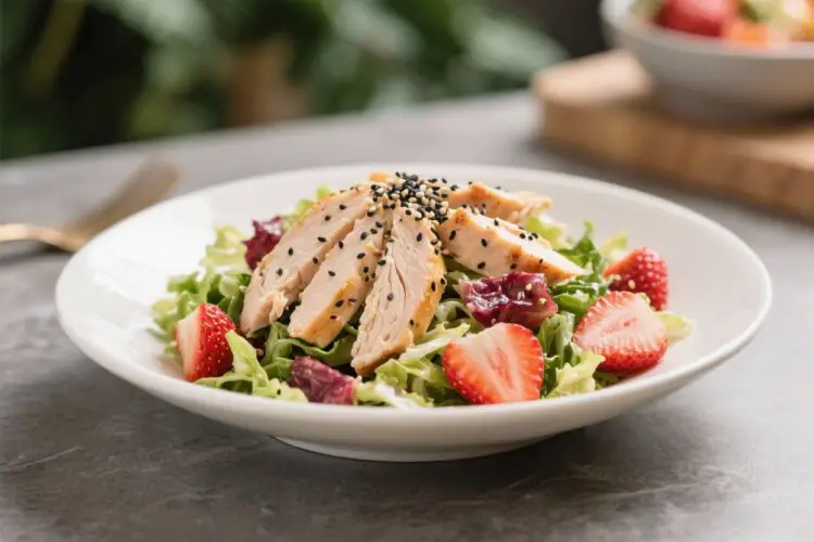 This Chicken and Strawberry Poppy Seed Salad is the kind of meal that feels light but still keeps you full. Sweet strawberries, juicy chicken, crunchy almonds, and a creamy poppy seed dressing make every bite balanced and lively. It’s quick enough for a weeknight and pretty enough for a lunch with friends.