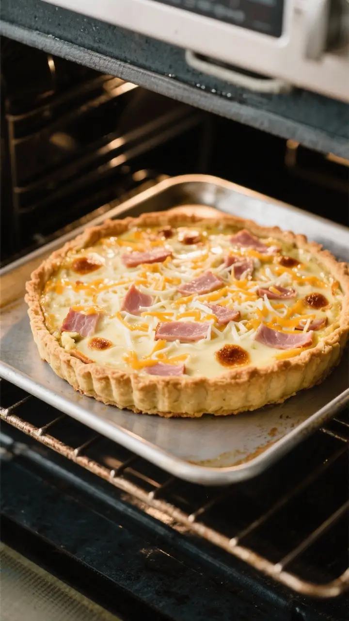 - Bake. Place the quiche on a baking sheet to catch any drips and bake for 35–45 minutes. It’s done when the edges are set, the top is lightly golden, and the center jiggles just slightly.