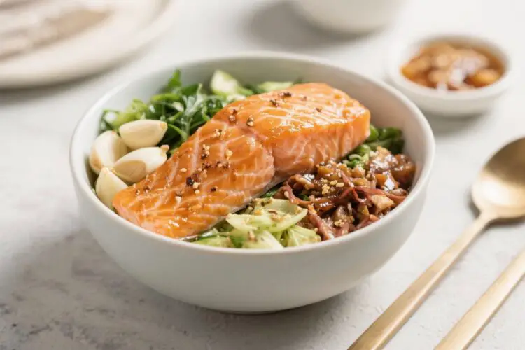 This bowl is all about contrast and balance. The salmon gets lacquered in a glossy honey garlic sauce that’s sticky, garlicky, and a little smoky if you let it caramelize.