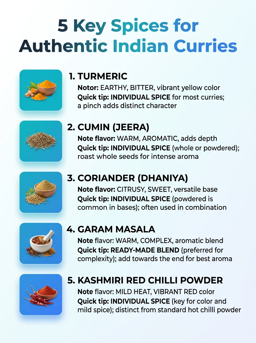 Think of these five as your curry toolkit. Everything else, from cardamom to star anise, is an upgrade you add when you are ready to go deeper.