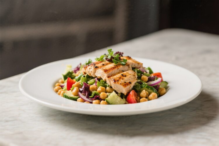 - Protein and fiber: Grilled chicken and chickpeas keep you full and steady your energy. Fiber supports digestion and helps with satiety.