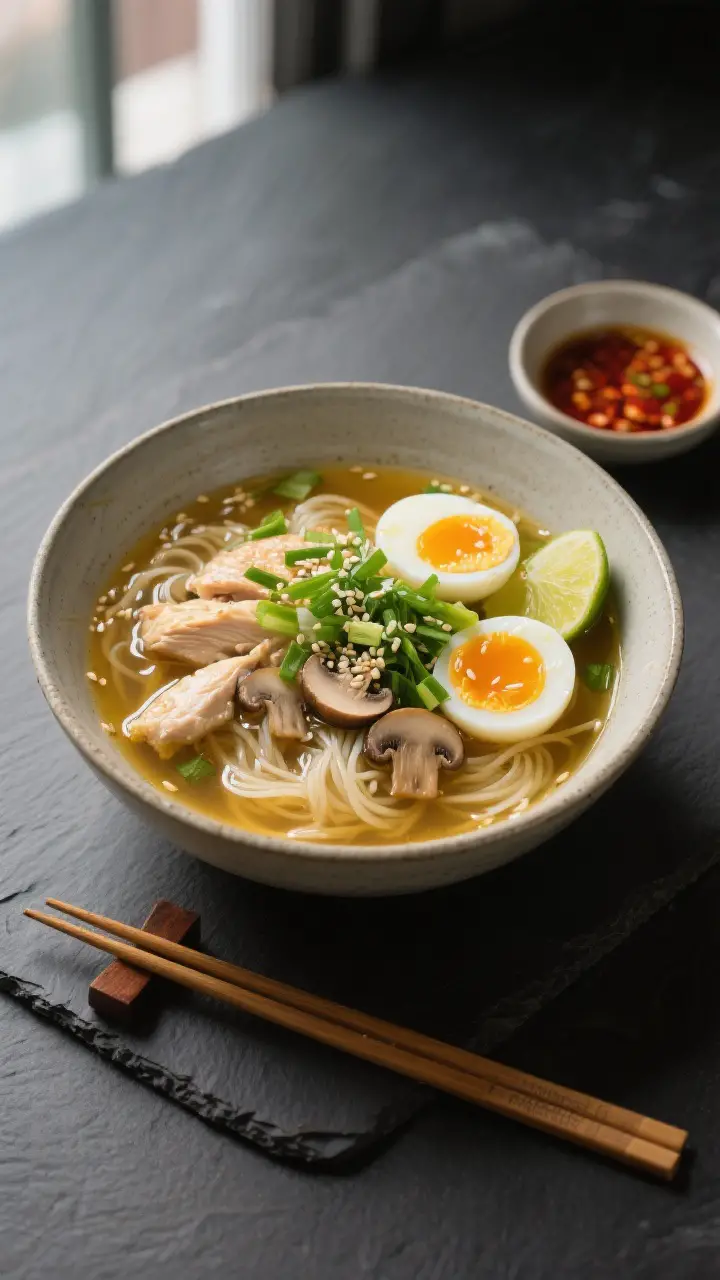 This isn’t “college dorm microwave ramen” energy. This is fragrant, layered broth with real depth—thanks to a smart combo of ginger, garlic, soy, sesame, and a squeeze of lime. The microwave lets the aromatics bloom quickly without babysitting a stovetop.