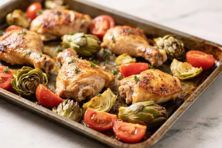 This is the kind of dinner that makes weeknights feel effortless. You toss everything on a pan, let the oven do the work, and end up with juicy chicken and caramelized veggies. Artichokes bring brightness, tomatoes turn jammy and sweet, and the whole thing tastes like you tried harder than you did.