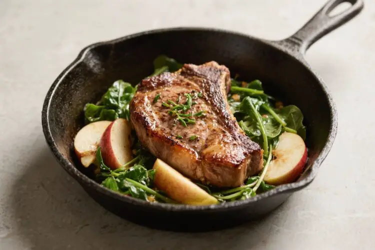 Seared pork chops, sweet-tart apples, and a tangle of tender spring greens make a simple dinner feel special. This recipe leans on pantry basics, cooks in one pan, and brings big flavor without fuss. The apples caramelize, the pork stays juicy, and the greens wilt into a silky, savory base.