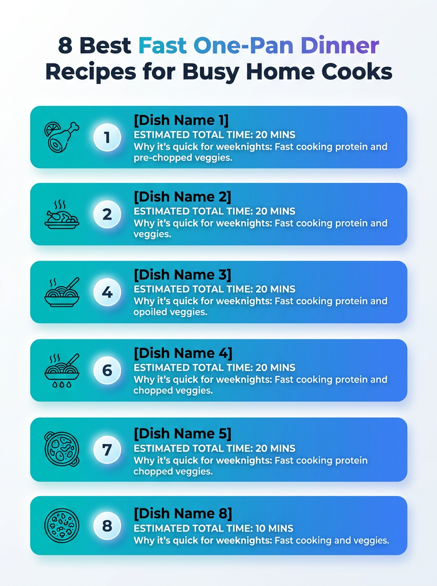 Eight quick, one-pan dinners for busy weeknights. This infographic highlights prep times and essential ingredients for each recipe.