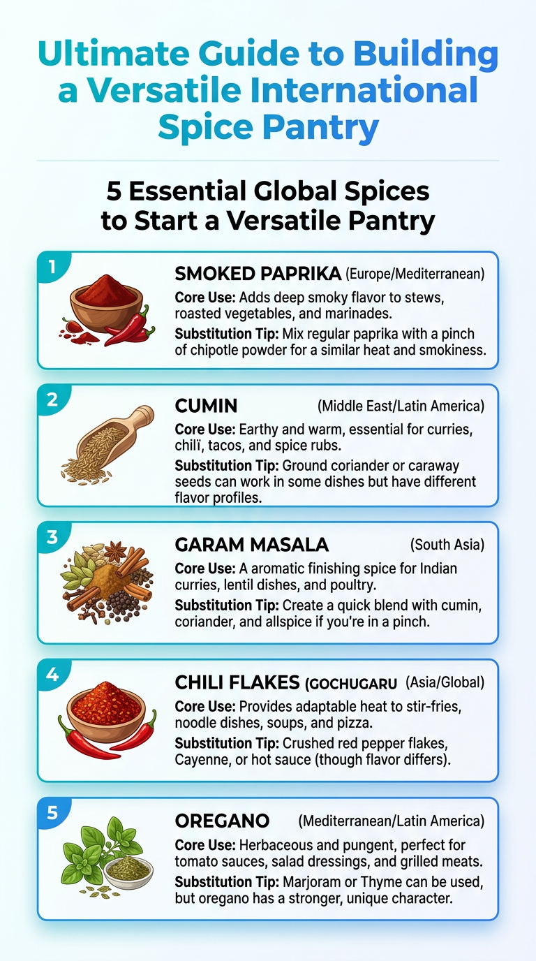 Five global spices to kickstart a versatile pantry. This infographic highlights key staples from around the world to diversify your cooking.