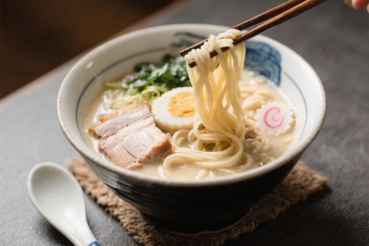 Thin, straight ramen noodles (Hakata-style) pair best with tonkotsu. Fresh noodles cook fast and hold texture.
