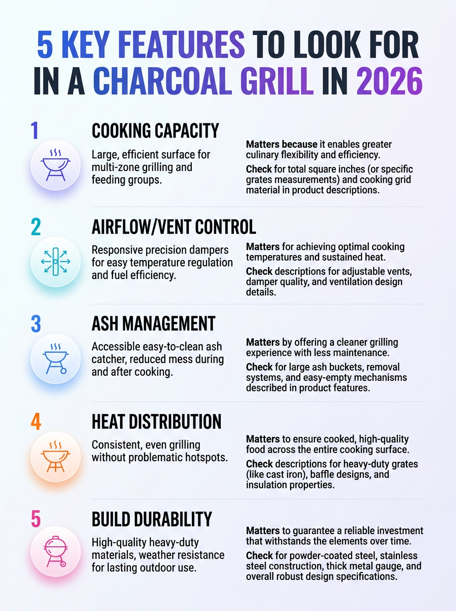 Discover the top 5 features to consider when choosing a charcoal grill in 2026. This visual guide helps you compare options and pick the best grill for your grilling style.