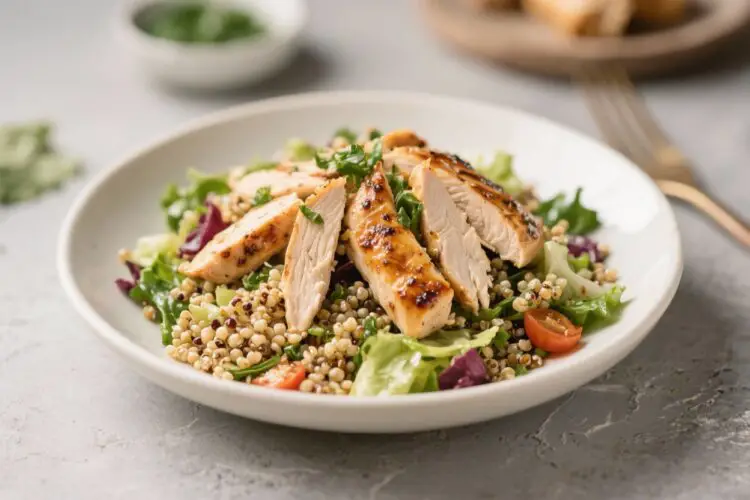 Warm doesn’t have to mean heavy. This simple chicken and quinoa salad brings together juicy, seasoned chicken, fluffy quinoa, and crisp vegetables with a bright lemon dressing. It’s the kind of meal that feels cozy but still light, perfect for weeknights or make-ahead lunches.