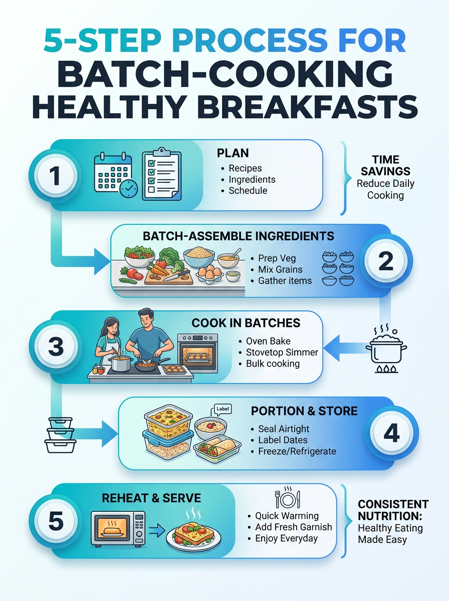 A concise visual guide to batch-cooking healthy breakfasts in five steps. Learn how to plan, prep, and store for quick mornings in 2026.