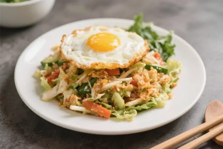 Yum Kai Dao is the kind of dish that proves simple ingredients can taste incredible. It’s a Thai salad built around crispy fried eggs, tossed with lime, fish sauce, sugar, chilies, and fresh herbs. The flavor is bold and balanced: salty, sour, slightly sweet, and pleasantly spicy.